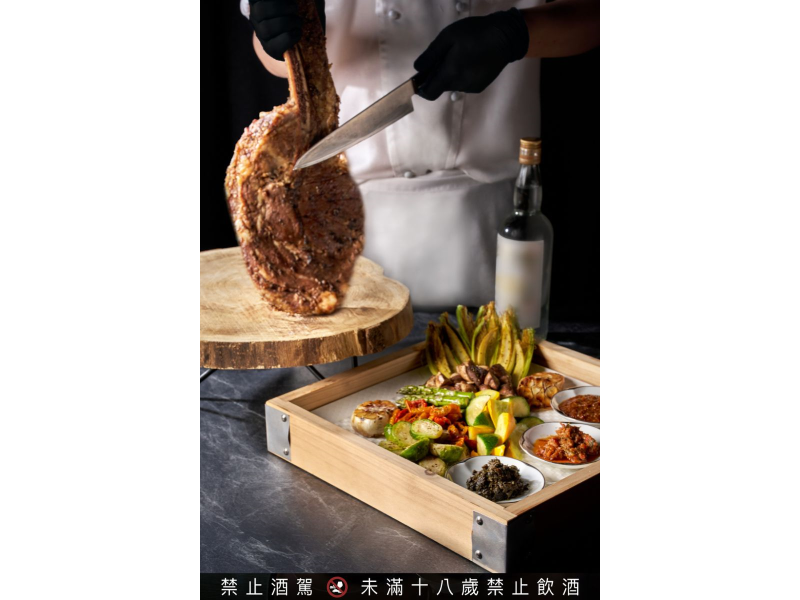 此外重足 2公斤的「粵式慢火戰斧牛」則創意發想自西式戰斧牛排與伊比利火腿的意象延伸,選用戰斧牛醃入港式風味的蒜味紅蔥烤肉醬與58度金門高粱3天,再使用慢火爐烤3小時並搭配多樣蔬菜再一起烤上20分鐘,使其慢慢封存每一滴肉汁,而蔬菜亦能吸附滿滿牛肉油脂精華。