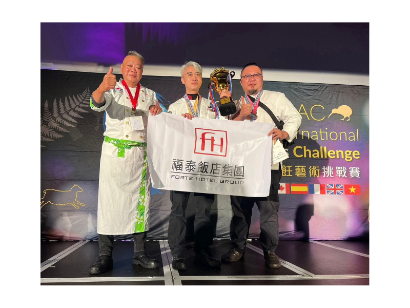 人物主圖圖說:汐止福泰大飯店副主廚陳聯官(圖中),榮獲2025大洋洲國際烹飪藝術挑戰賽主餐組「特金牌」及前菜組「銀牌」殊榮。
