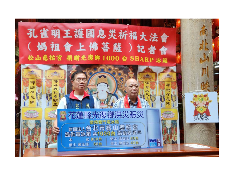 松山慈祐宮也盡一份心力,協助花蓮災後重建,目前正在募集約兩千台冰箱,希望能夠幫助受災地區的居民儘快恢復生活。這項善舉在大會會長蔡鴻祺師兄的熱心奔走下,已經陸續展開,蔡鴻祺是花蓮「雲山水」渡假山莊的負責人,災後第一時間就親赴現場支援,展現極大的慈悲與行動力。