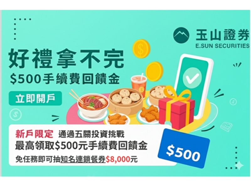 近期玉山證券推出新開戶優惠活動,提供多項豐富的開戶好禮,新戶完成限定5關投資挑戰,最高可領取$500元手續費回饋金;開戶完成,免任務即可抽知名連鎖餐券$8,000元,趁著這波開戶優惠、好禮大放送,開啟你的投資新旅程!