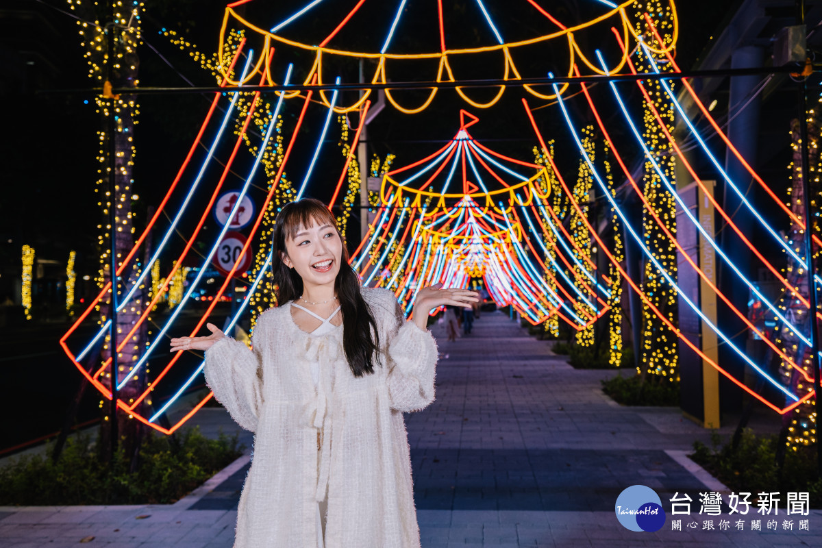 「2025新北歡樂耶誕城」除了大型藝術裝置外,今年周邊連通天橋與人行道也巧妙運用創意馬戲元素,結合光影燈飾,打造各式奇幻燦爛的馬戲團場景,例如小遠百天橋的「華麗空中飛人」以金黃燈海構築壯麗舞臺,燈條化作空中飛人的姿態,穿梭於光廊之上,為空間注入動感與驚奇。