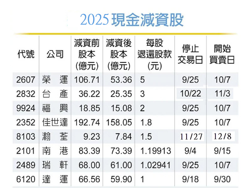 以2025年來看,有執行現金減資計畫的上市櫃公司,包括榮運、台產、福興、佳世達、瀚荃、