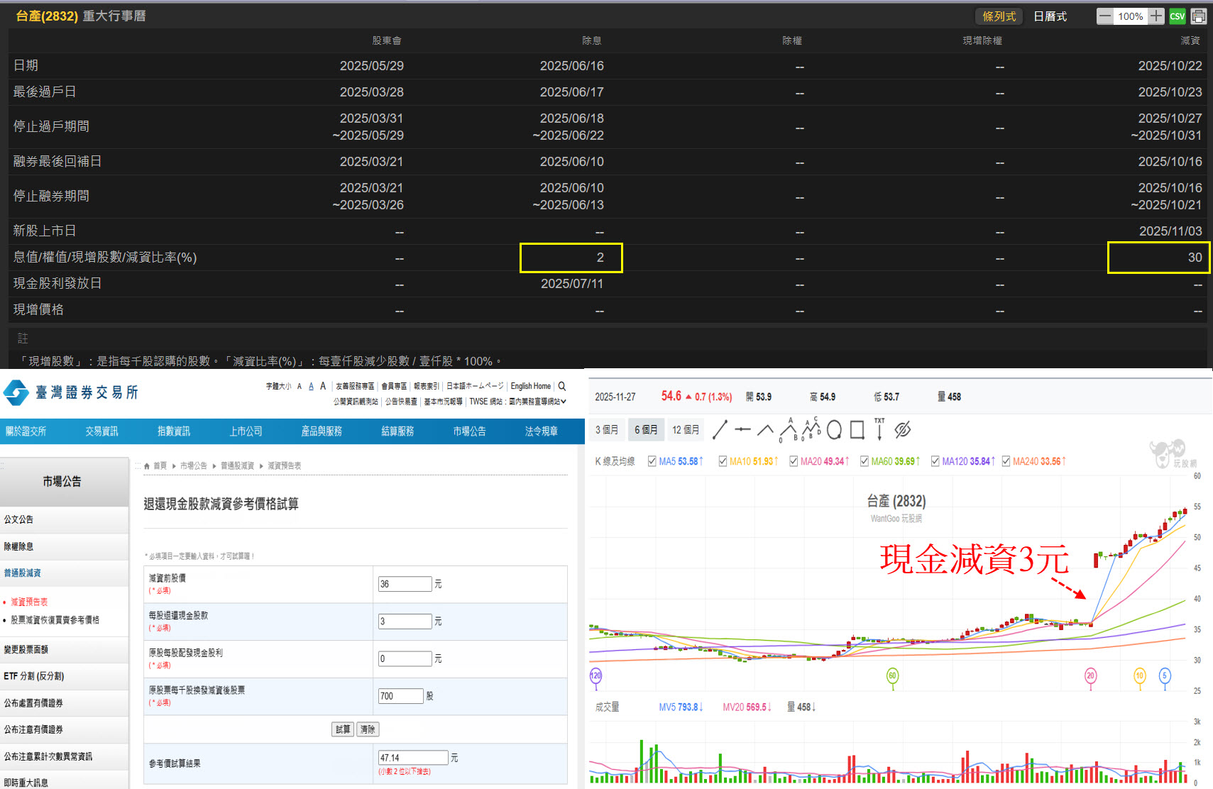 也就是11/3現金減資後,每張台產股東會拿到3000元現金(發放日11/13),股票變為700股,價格變高為47.14元。