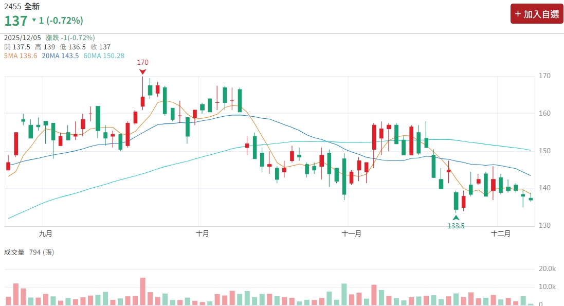 三五族龍頭大廠全新(2455)公布11月營收 合併營收2.85億元,為近3個月以來新低,月減 19.71%、年增20.16%,累計前1-11月營收達30.61億元,較去年同期增加2.29%。