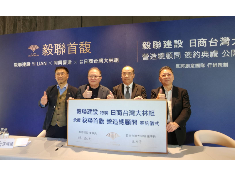 在大同區深耕的毅聯建設董事長陳啟育(左2),與日商台灣大林組董事長楊春榮(右2)及巨將創意團隊董事長張鴻遠(左1),17日舉辦簽約儀式;毅聯建設宣布與擁有百年歷史的「日商台灣大林組」締結合作,邀請其擔任大同區代表新案《毅聯首馥》之營造總顧問,為工程品質進行全程嚴格把關。本案亦成為大林組於大同區首度參與的營造顧問案,備受市場關注。