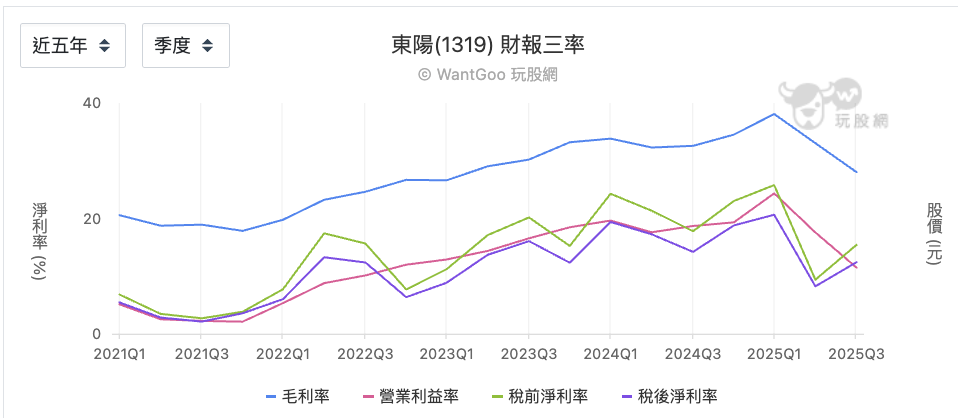 把時間拉長到五年,三率的變化其實清楚呈現一段完整的經營修復循環。2021 年仍處於疫情後低基期階段,毛利率約落在 18~20%,營業利益率僅 2~5%,稅後淨利率也在個位數徘徊,顯示當時本業獲利能力仍偏弱,屬於循環左側的修復初期。