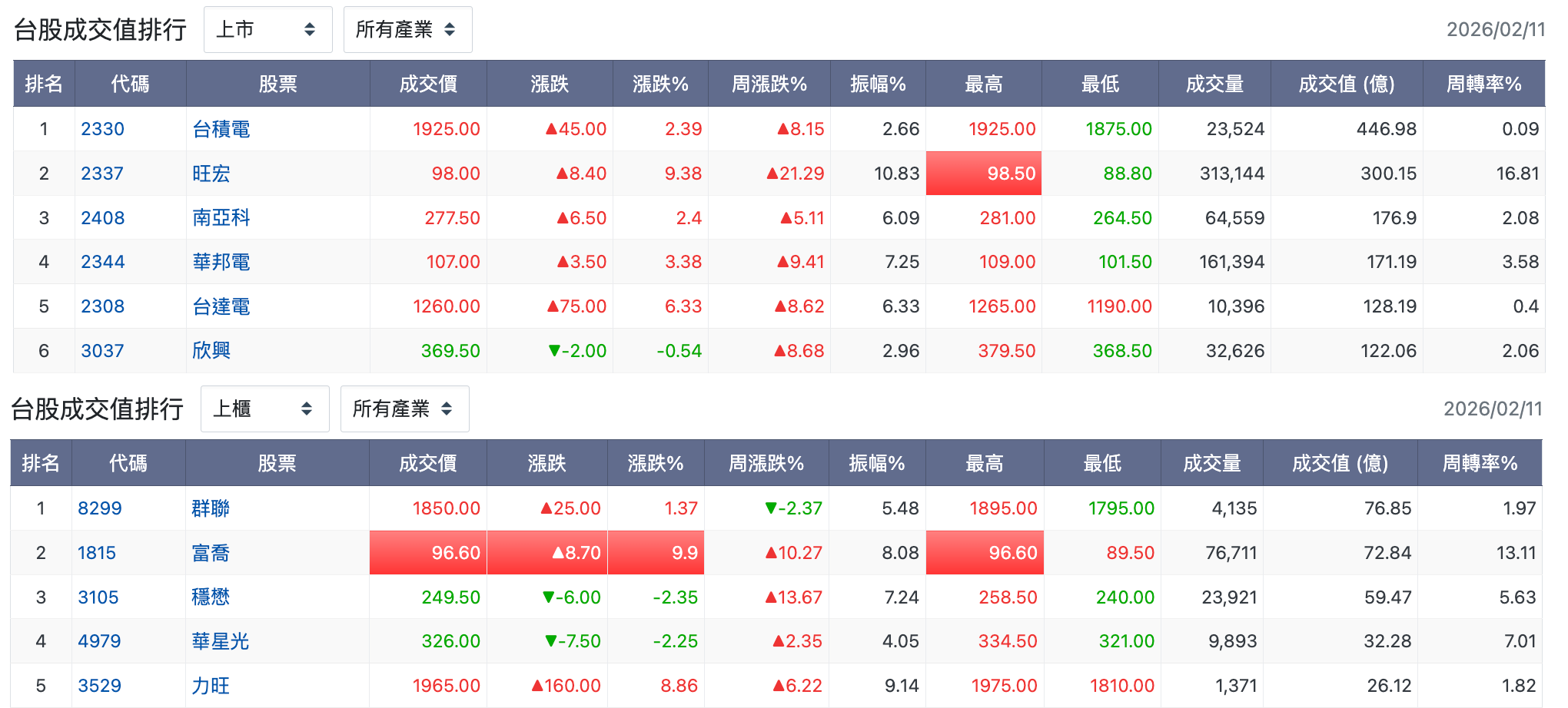 以今天成交值排行來看,除了台積電創高到 1925 元直接貢獻加權指數超過 300 點,記憶體族群則是在昨天華邦電法說會釋出對 DRAM 強力看法「 DDR4 缺口大到不曉得怎麼補」,旺宏漲停 98 元創 2000 年 6 月以來股價新高。
