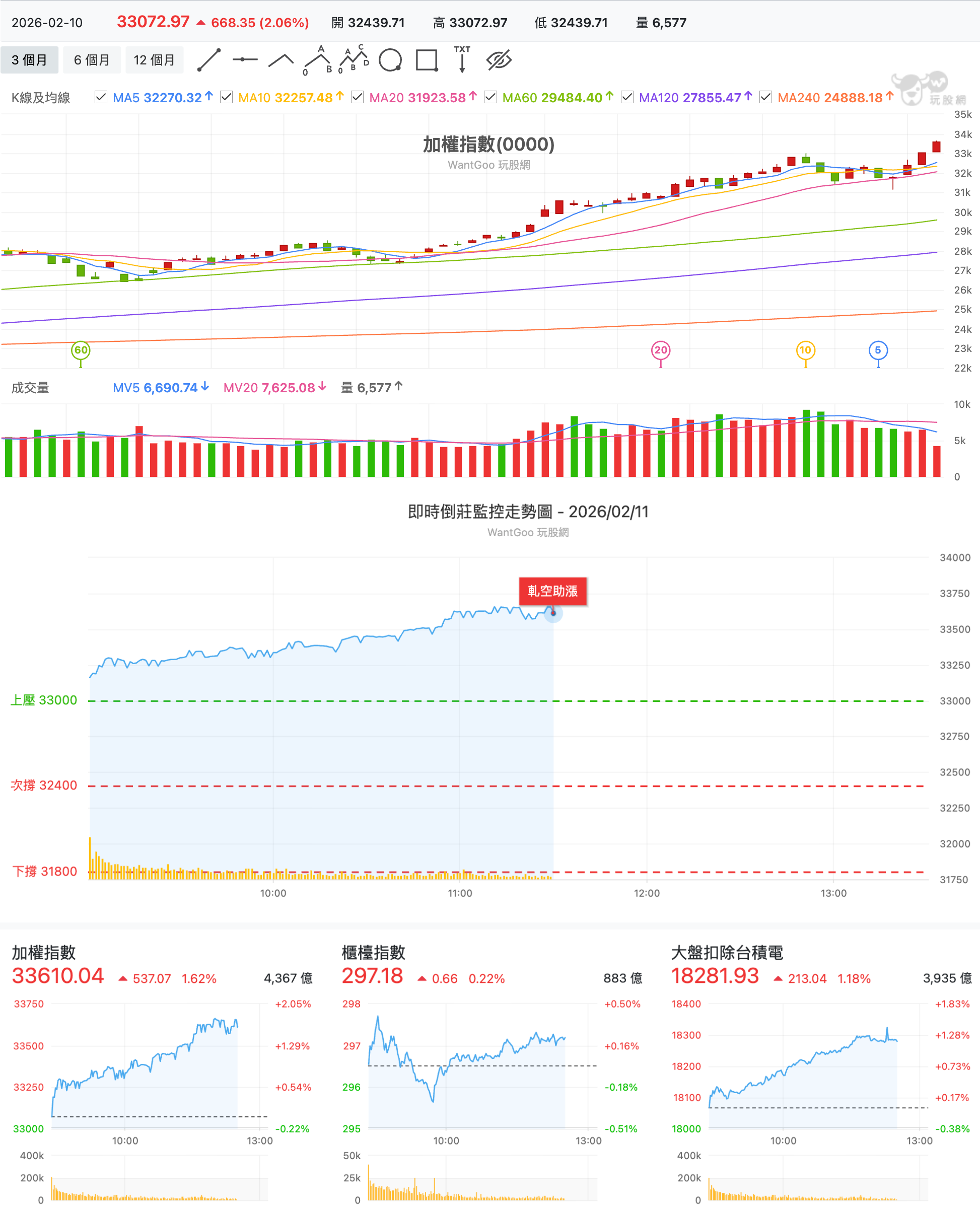 - 今天就是年節封關日,加權指數不但沒有以往觀望量縮的氣氛,昨天漲 668 點衝破 33000,今天續漲近 500 點站在所有均線上,預估成交量突破 7000 億。外資已連續買超兩天合計超過 800 億,昨天大買群創 2.4 萬張,並加碼創新高的台積電 1.26 萬張,另外高股息 ETF 00878、00919 也分別獲得 2.8 萬張與 2.6 萬張買進。不過期貨則是在假日前增加避險空單 1299 口。於此同時,融資則是在假日前撤退約 28 億,出場 00632r 近 8000 張。