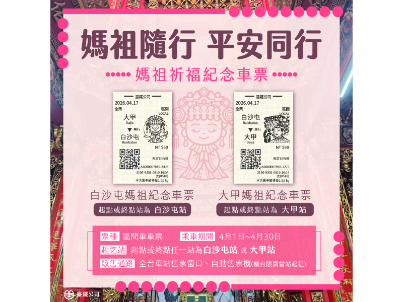 【理財周刊記者顏瓊真報導】臺鐵除了「成功─追分」的車票熱銷外,為響應白沙屯媽祖進香與大甲媽祖遶境兩大宗教盛事,今(2026)年特別推出「限定Q版媽祖祈福紀念車票」,以溫馨可愛的媽祖形象結合車票設計,陪伴旅客踏上朝聖之路,讓車票不僅是乘車憑證,更成為值得珍藏的特色紀念!