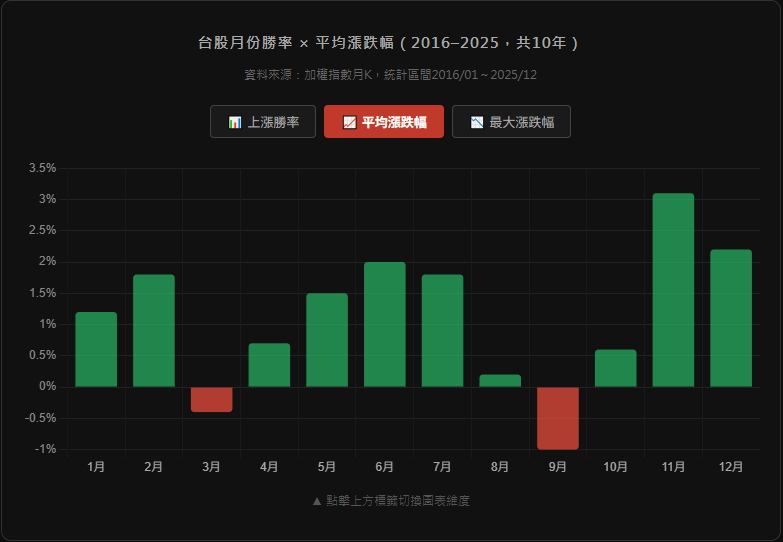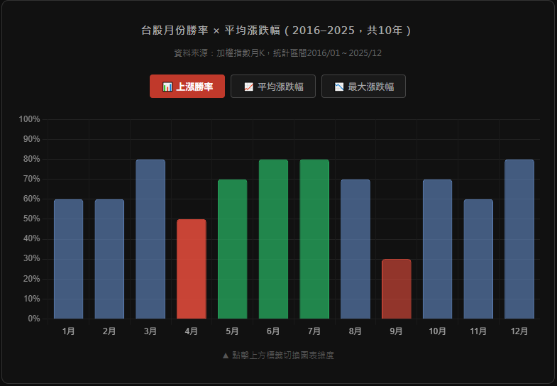 【台股近十年每月漲跌幅機率 2016–2025】