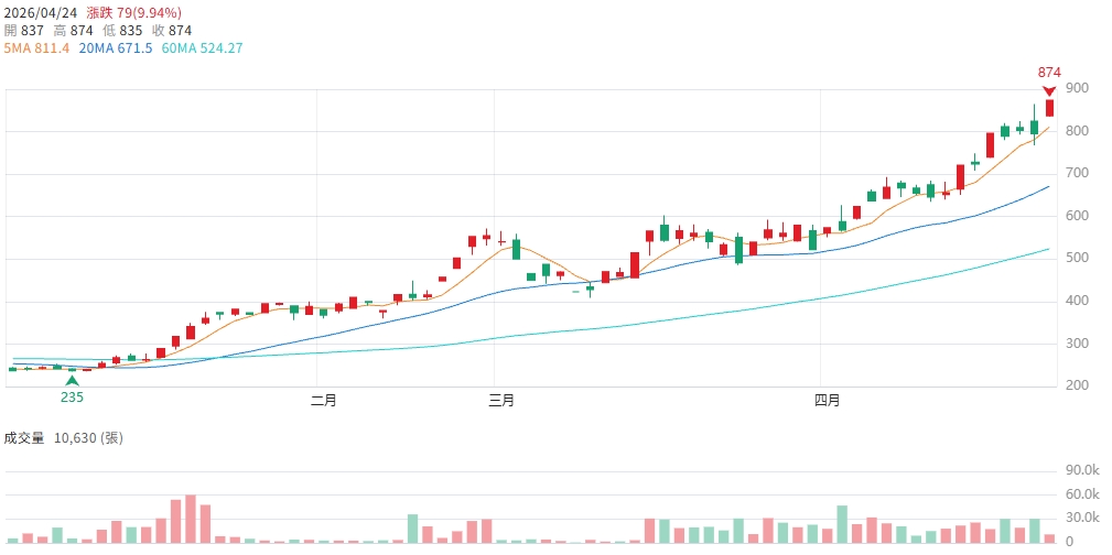 AI伺服器、ASIC與800G交換器需求爆發,帶動高階ABF載板從供過於求急轉為供需缺口擴大,南電(8046)直接受惠,股價從低檔一路狂飆,4月24日盤中攻上874元、漲幅達9.94%,前一交易日單日成交金額更高達246.8億元,爆量換手創波段天量。基本面方面,南電2025年Q4單季獲利已超越前三季總和,2026年Q1淡季不淡,投信近5日持續買超2,365張,市場預期ABF漲價落地後毛利率加速改善,法人目標價上看千元關卡。