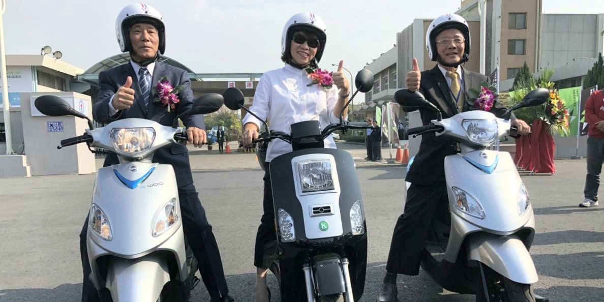 圖片說明:台灣中油董事長戴謙(右)、嘉義市長黃敏惠(中)、三陽工業董事長吳清源(左)試乘電動機車。