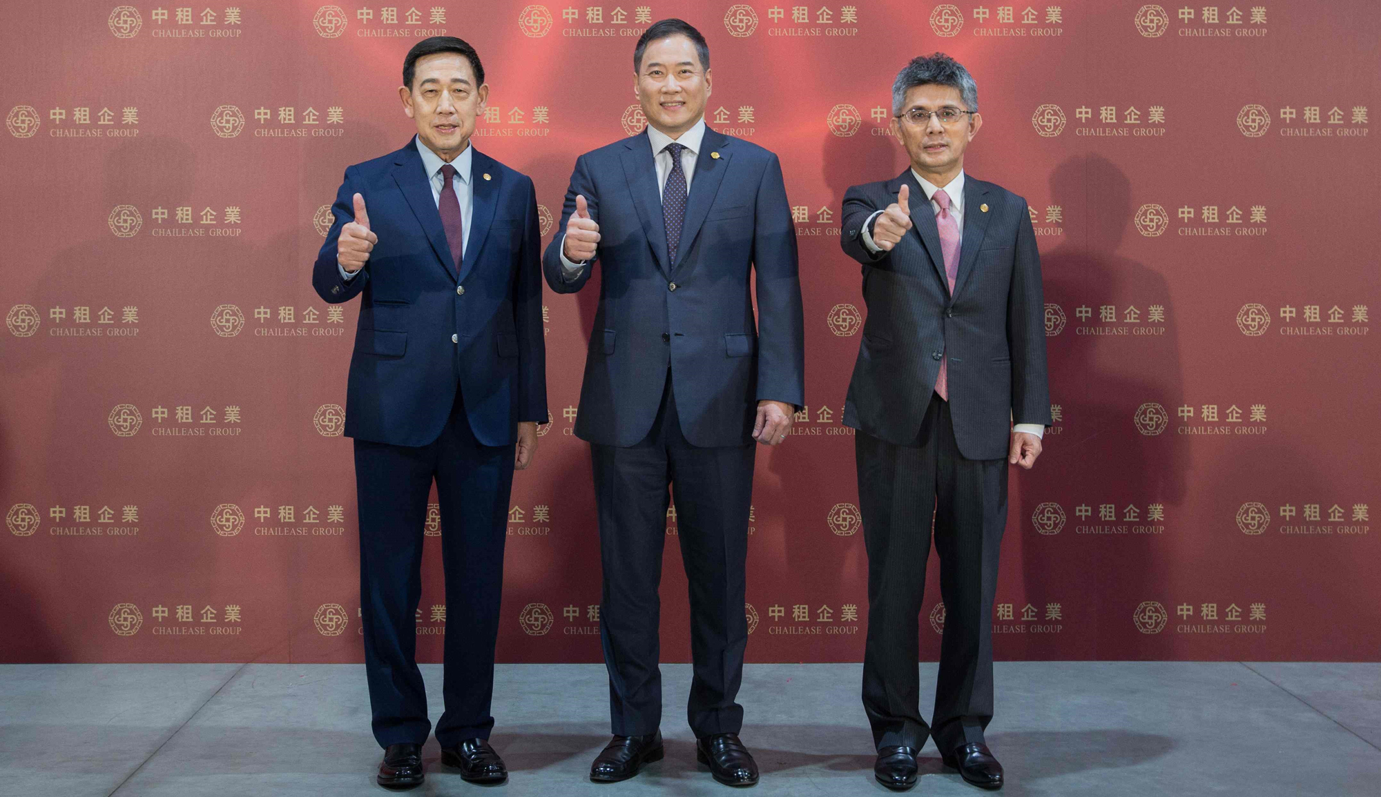 圖片說明:中租企業總裁辜仲立(中)、中租控股董事長陳鳳龍(右)與中實控股董事長黃炳彰(左),帶領集團營收創新。