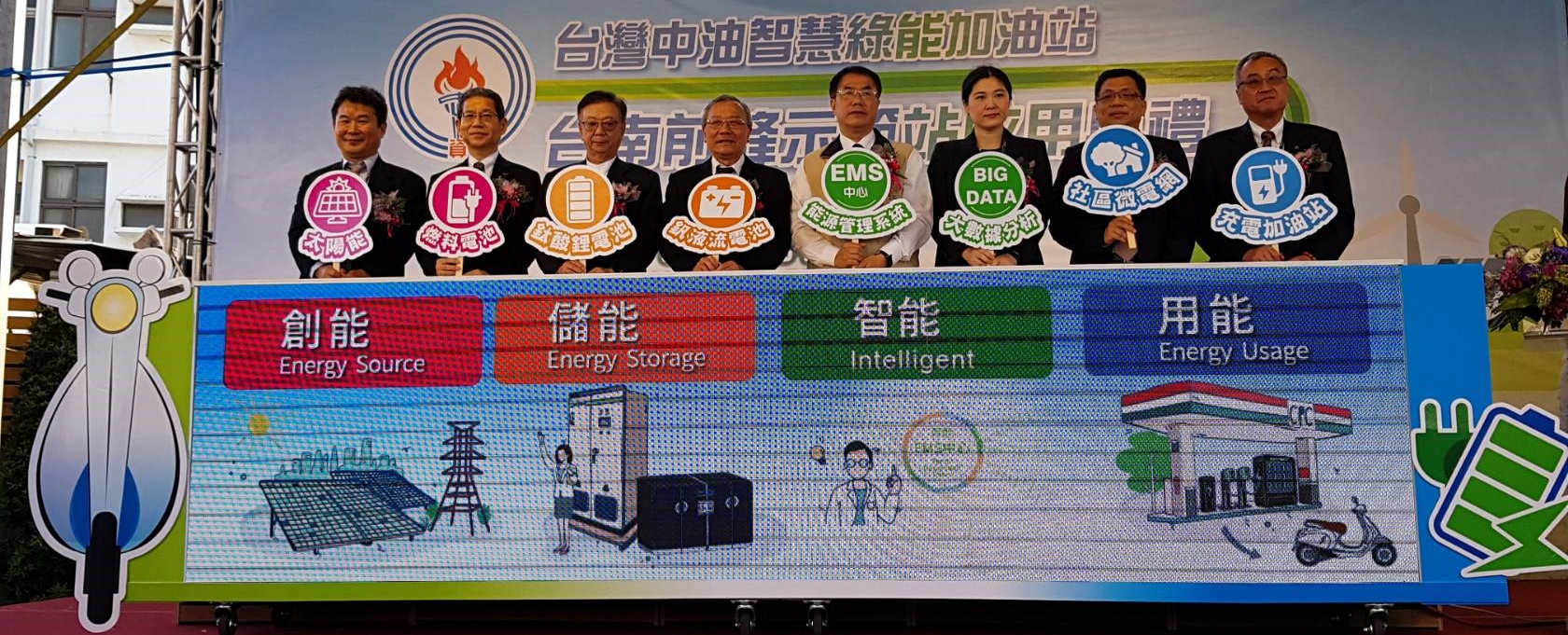 為配合政府能源轉型政策,台灣中油推動智慧綠能加油站,第一階段規劃兩座示範站,兩站設計方式不同,嘉義信義路示範站係以屋頂型太陽能發電系統發電,透過鋰離子電池儲能系統儲能,再以智慧型EMS能源管理系統進行調節,綠能電力幾乎可達自給自足;台南前鋒路示範站則採多元電力供應及儲能系統,供應加油站平均每天320 kWh,電動機車充/換電每日150 kWh的用電支援,提供加油站與電動機車充/換電需求。
