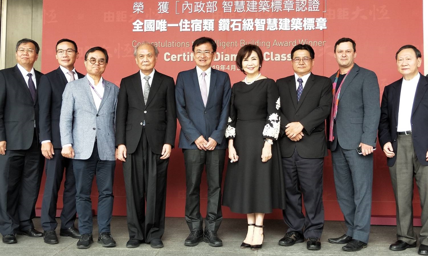 董事長林嘉琪(右4)日前接受營建署長吳欣修頒發「鑽石級智慧建築」證書,也同時接受台中市都發局長黃文彬頒發「耐震標章」。