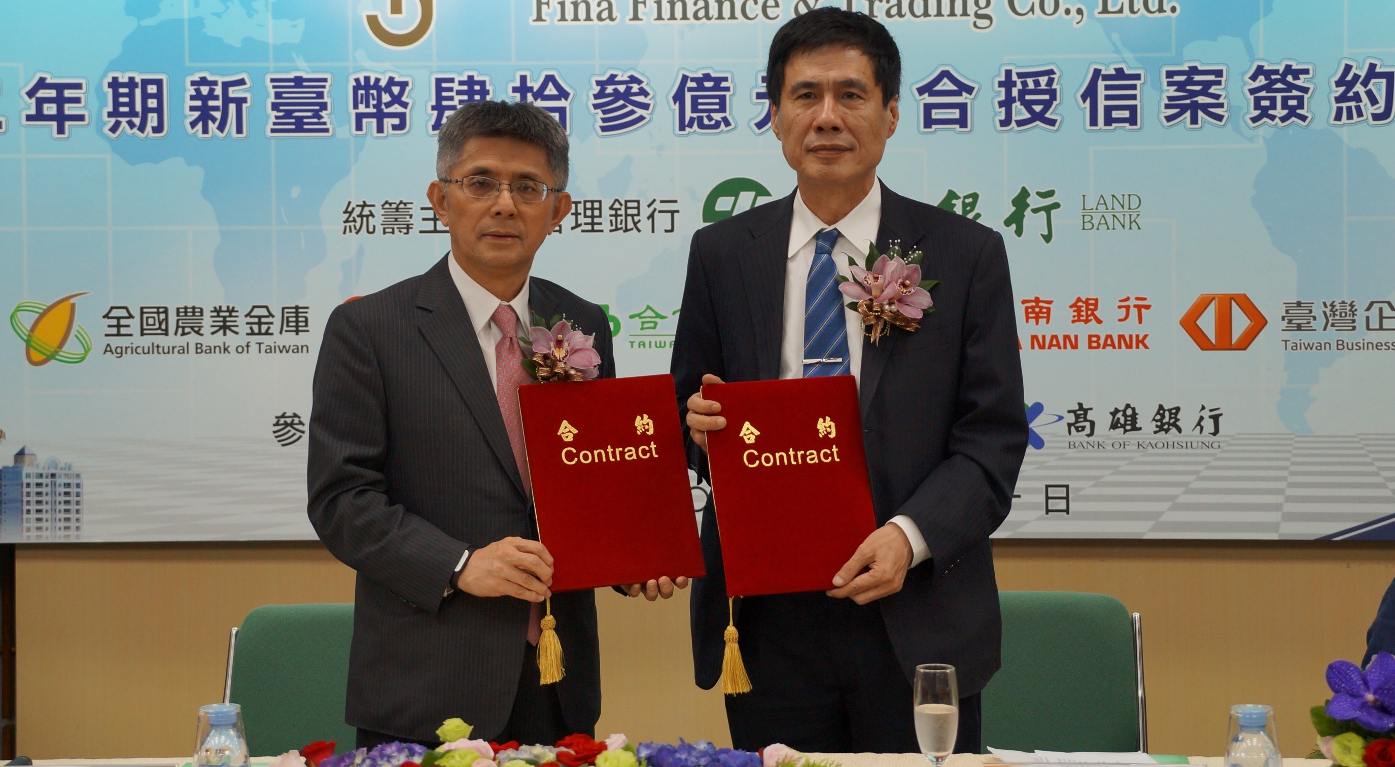 圖片說明:中租控股兼合迪公司董事長陳鳳龍(左)與土地銀行董事長黃伯川代表10家銀行團簽訂合約。