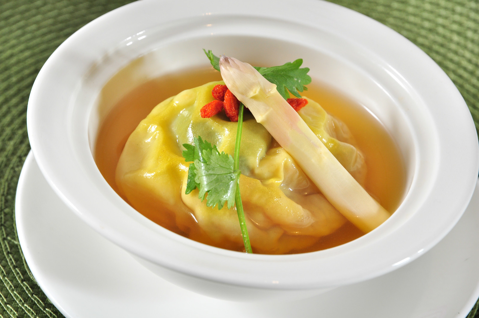 「香茜蘆筍灌湯包」使用澄澈光澤金黃的濃郁雞高湯承載著一顆滑順而真材實料的湯包,白蘆筍引導出更迷人別致的鮮甜風味,瞬間清新度倍增,令人回味無窮。