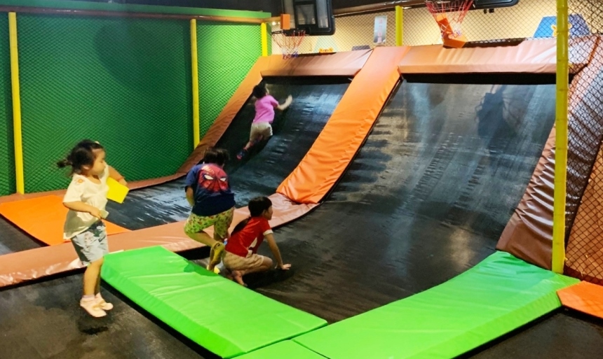 最受歡迎的「繩網迷宮」高達兩層樓,有搖晃圓形鞦韆、輪胎吊橋、沙包障礙物等多樣攀爬關卡,還有大型球池、可坐著輪胎滑下來的溜滑梯及VR互動遊戲牆,小朋友穿梭玩樂其中,就像在恐龍森林中探索一樣。