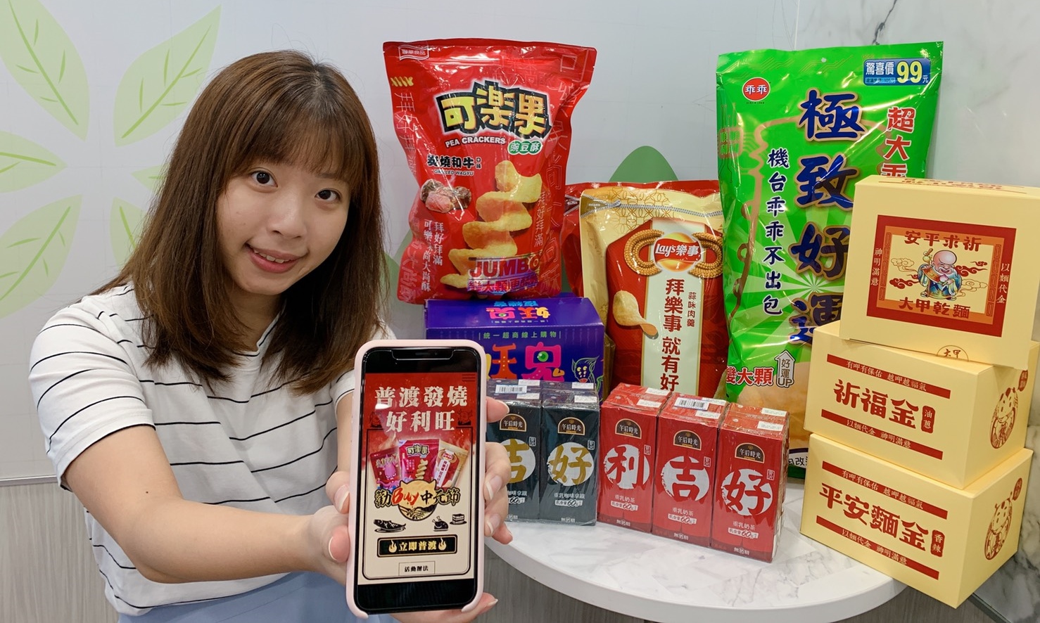「拜創意」系列則是以「大甲乾麵平安麵金」最吸睛,共有油蔥、香辣,以及麻醬三種口味,分別對應祈福金、發財金、平安麵金三款不同造型;另外還有「樂事蒜味肉羹味洋芋片」及「樂事波樂金黃蝦捲味洋芋片」,包裝直接印有招財旺市及拜樂事有好市兩種款式;以及推出好、吉、利、拜、誠、意6種款式的「午后時光重乳奶茶」,中元普渡更應景。