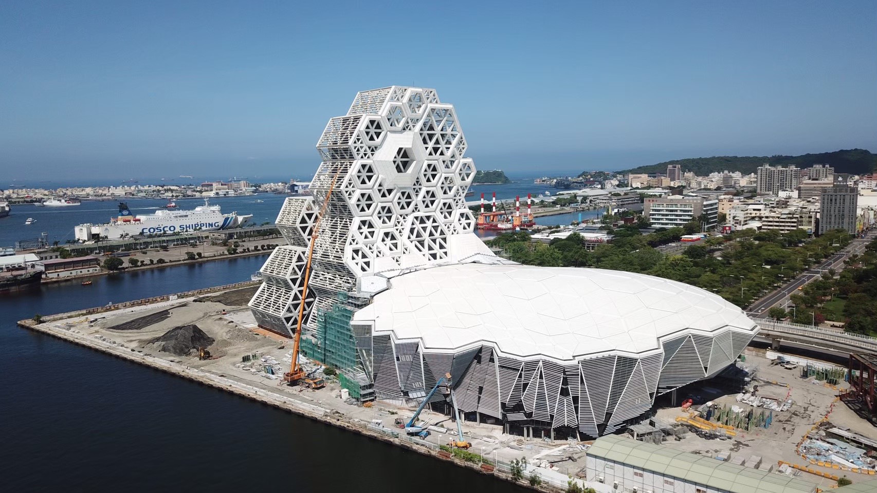 工務局新工處表示,海音中心在施工期間遭遇諸多問題及挑戰,例如於既有碼頭施工需整合複雜的既有設施及管線、異型鋼構組裝的挑戰、特殊多向度六角造型帷幕組裝製作等,皆由各專業團隊戮力克服,期能樹立公共工程創新及突破的典範。