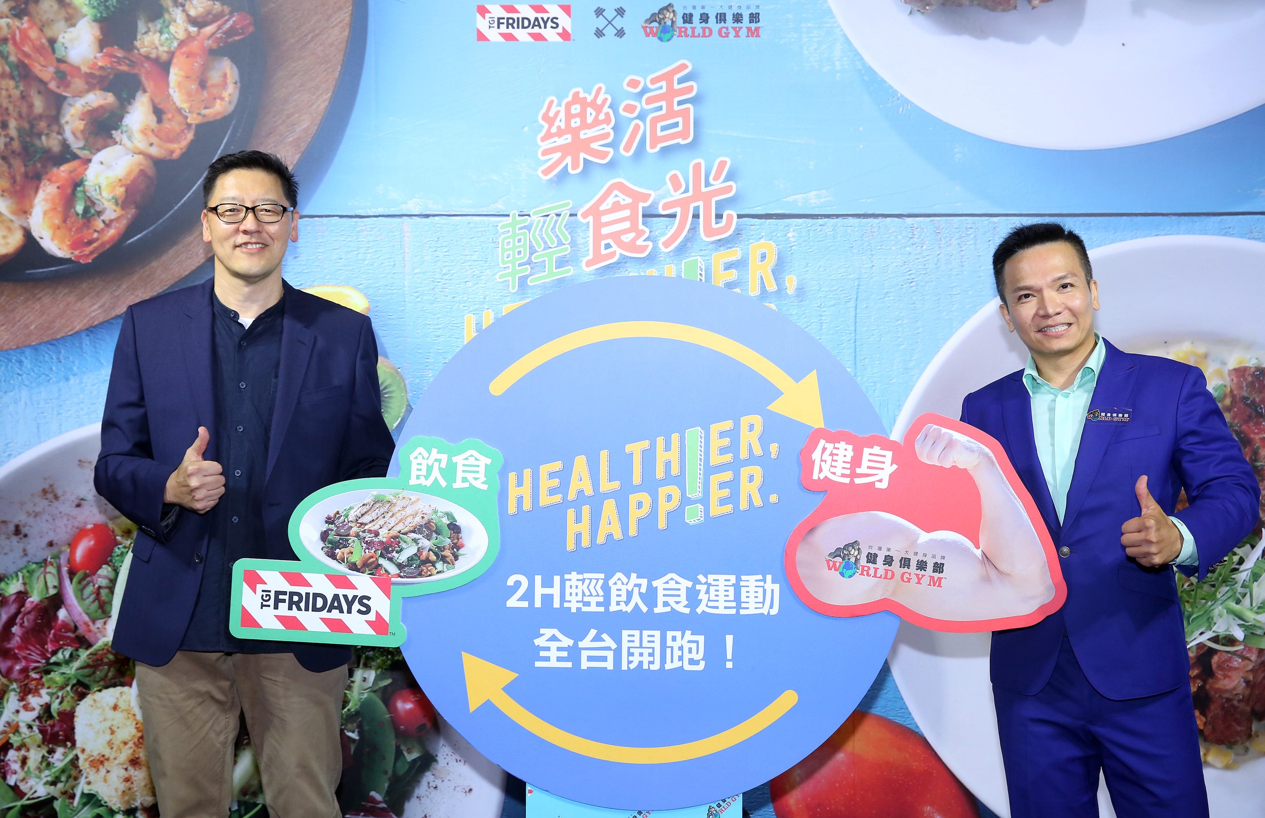 圖片說明:TGI FRIDAYS台灣區董事總經理李宏智(左)與World Gym世界健身俱樂部運動部副總薛有哲攜手搶攻百億運動商機。(圖由TGI FRIADAYS提供)