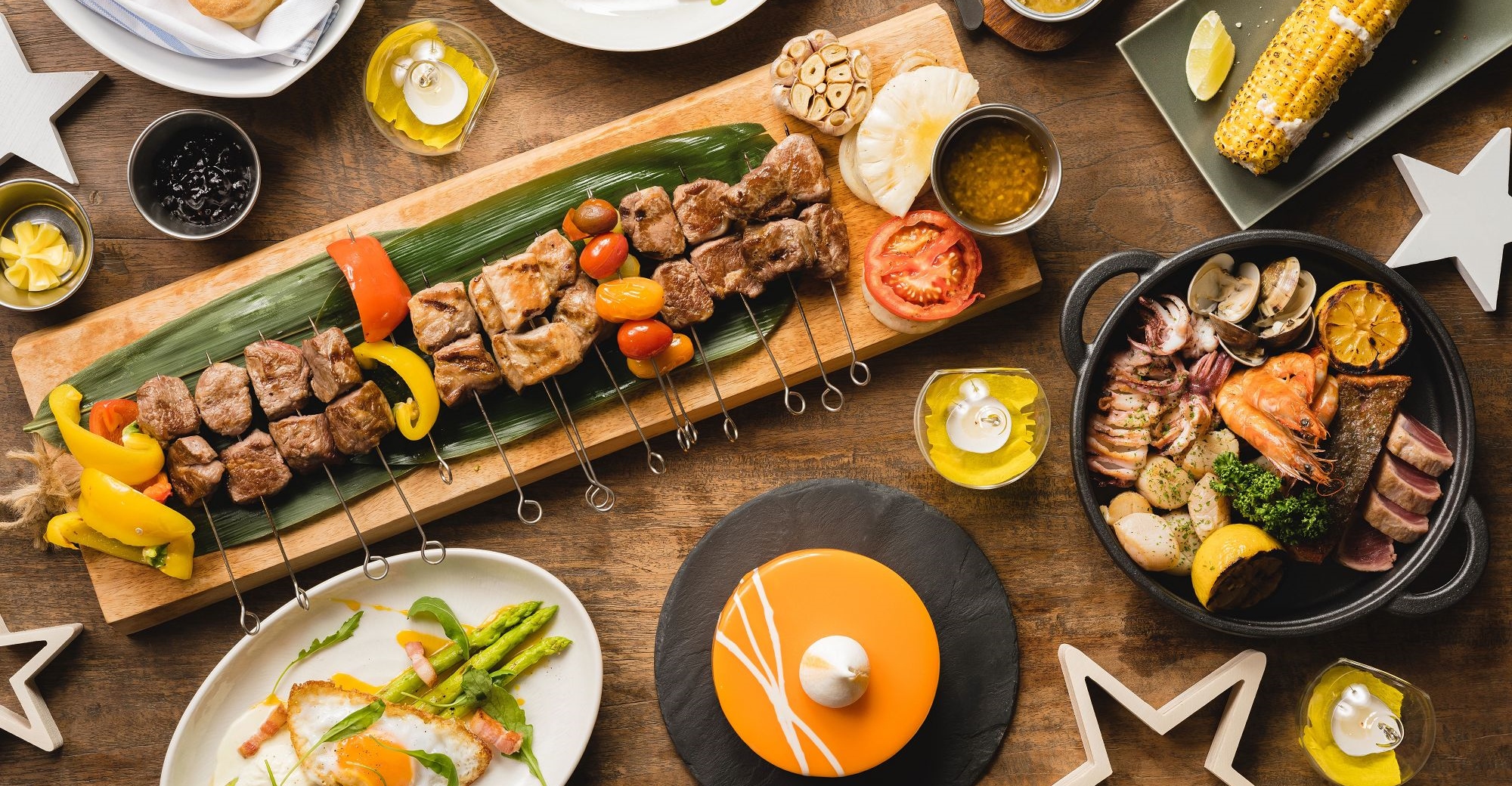 今年的中秋連假,肉食主義的朋友們有福啦!意舍廚藝團隊在Buttermilk推出「中秋海陸燒烤四人分享餐」,主菜燒烤海鮮拼盤內有牛肉、豬肉與羊肉等燒烤串組合之外,還有鮮蝦、東港小卷、鮪魚、挪威鱒鮭、干貝等多種食材,豐富組合絕對滿足全家人的胃口!