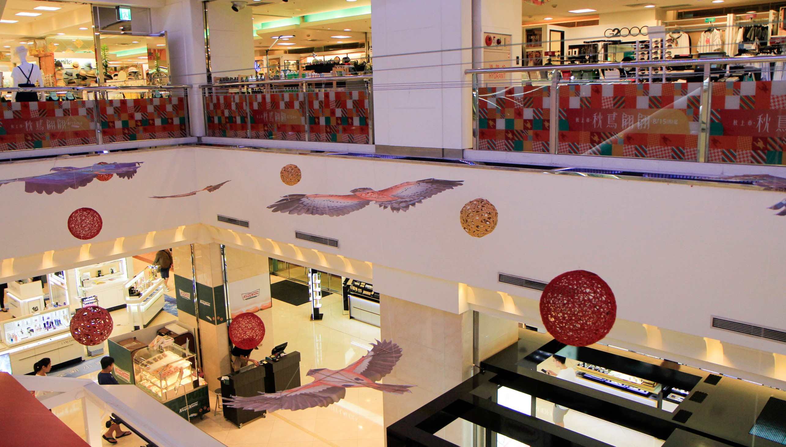 以打造成為雙北新南區生活中心,兼具人文、經典及好生活的比漾廣場,入秋後,整個空間也秋意篇篇,消費者在逛街時,可時時拚頭看看,會發現不少秋鳶。