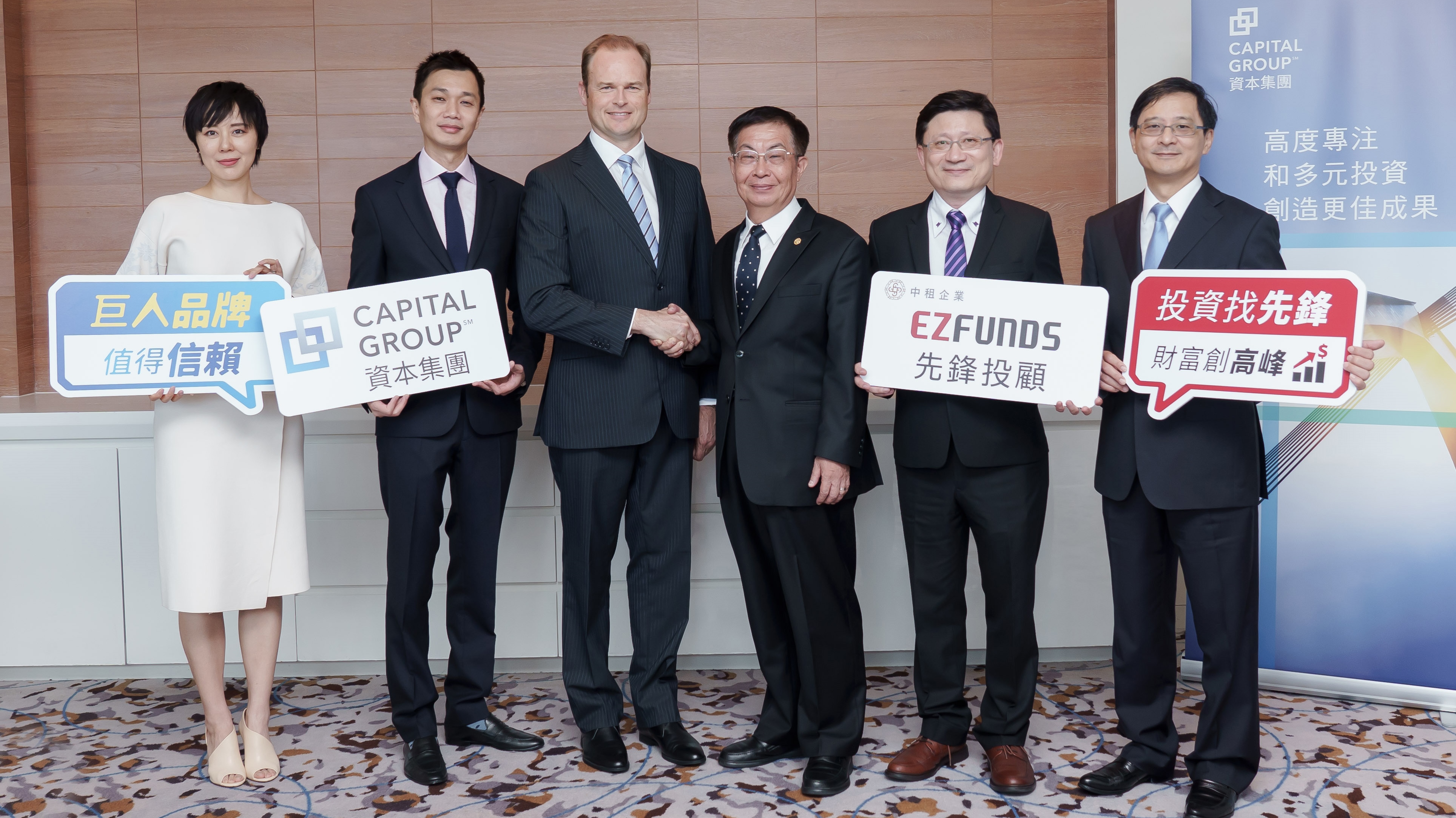 陳俊傑(右2)表示,「員工擁有股份制度」、「多重基金經理制度」等制度,造就資本集團的成功要件,資本集團目前引進台灣的基金檔數有四檔股票型基金、四檔債券型基金、一檔平衡型基金,其中,資本集團全球機會高收益債券基金(本基金主要投資於非投資等級之高風險債券且配息來源可能為本金),在今年競爭激烈的理柏台灣基金獎項中,拿下3年期環球高息債券基金獎,操盤實力堅實。先鋒投顧未來將努力引進資本集團旗下表現優異的基金,供投資人更多理財選擇!