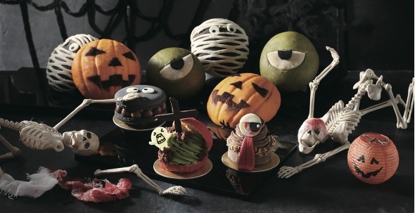 甜點部份,搗蛋鬼魂為綴以白巧克力鬼魂和十字架的抹茶菠蘿泡芙;鬼趣爵士以香蕉巧克力起司塔為底,結合伯爵巧克力慕斯,搞怪大眼吐舌表情,可愛逗趣;黑鬼煤炭則是以竹炭馬卡龍為主體,擠上香滑的苦甜巧克力及果香馥郁的柑橘餡,馬卡龍上的圓溜大眼童稚有趣。