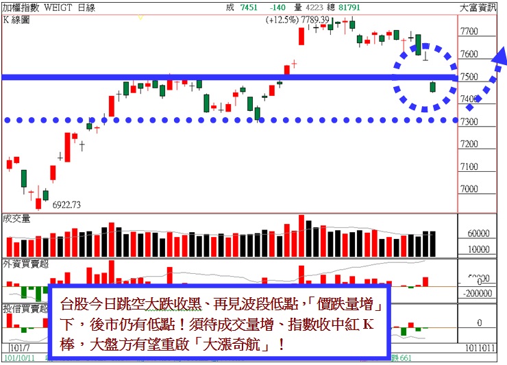 雖然今日台股見到一道多達近百點的跳空缺口橫亙在眼前,對市場多方形成十分沈重的上檔鍋蓋壓力,要想在短時間見到明顯、大幅度的漲升走勢,將此一上檔反壓缺口順利回補,幾乎可以說是一項不可能的任務。