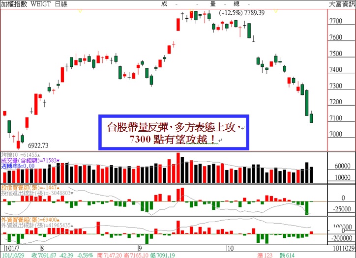 就台股整體成交量能今日的盤中預估水位高低情況看來,成交量一度逼近900億元水位下,已經清楚反應出市場多方目前的強力作多護盤心態。如果在接下來的幾個交易日之內,能夠順利見到台股成交量能水位持續達到800億元以上水位,同時也能見到大盤指數以紅盤漲勢作收的多方控盤走勢,預料台股在即將來臨的十一月份行情走勢,就有機會可以見到指數短線觸底後的波段反彈漲勢。