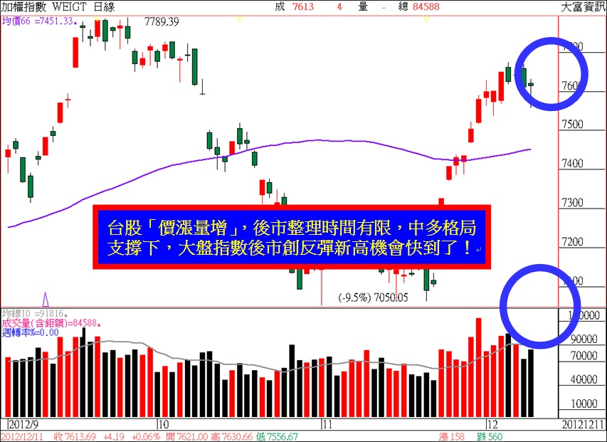 多頭仍力圖將大盤指數成功維持在,自上週四見到反彈波段高點開始修正下跌,直到目前為止,一個走勢型態十分清楚的「高檔震盪」格局,約7550~7650點左右的區間整理位置,更希望能夠將指數進一步強勢支撐於十日均線-7582點之上,成功維繫住台股市場現階段,好不容易又重新聚集起來的熱絡人氣,以利下一段的漲升波段繼續延伸下去,再將大盤指數往更高點位置推升。