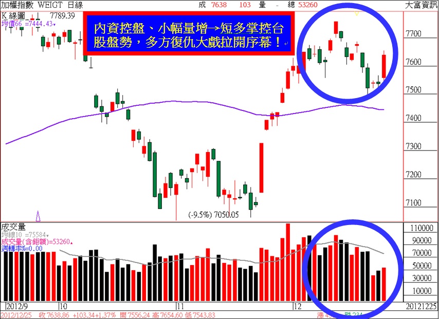 不過,由於市場上另外一咖的操盤主力-「外資」,目前正在大放年度假期,暫時無心也無意願、無入市動作。因此,如果要探究今天台股這樣的跳空開高、盤中急拉漲勢,對大盤後市走勢的影響、激勵效果能夠有多強、多大,延續的時間會有多久的話,可想而知的是,在缺少了「外資」這一個重要的「大咖」腳色之下,自然盤面的成交量能水位就無法見到900~1000億元以上水準,盤面上多檔權值股、高價電子指標股的股價也就不會有後續的續強漲升機會,當然也就沒有辦法能夠有效的將大盤指數往上繼續推升。