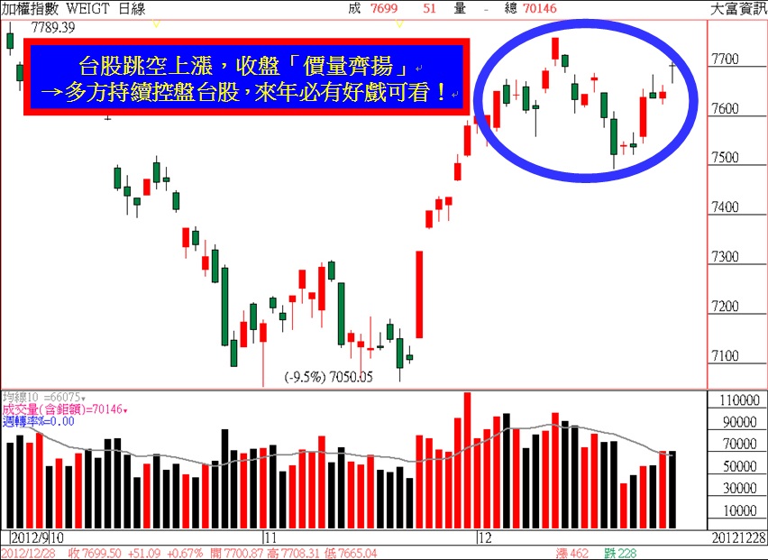 儘管歐美股市昨日收盤再次見到漲跌表現不一格局,而日、韓為首的亞股市場今日早盤也跟進出現開盤走勢開出高、低盤不一的走勢型態,但台股場上的主力控盤手作多今年最後一個交易日、力圖最後以紅盤漲勢中紅K棒作收的企圖心,十分地強烈、明顯,使得大盤指數今天早上一開盤就大幅跳空上漲了52.4點,場上多方試圖將台股指數推升、攻上、站穩7700點整數關卡的「用心良苦」,其實令人感受相當深刻。