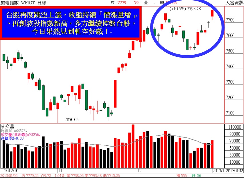 在歐美股市今(2013)年第一個交易日同步以紅盤漲勢開出亮麗紅盤作收的激勵之下,儘管日股今日因新年假期而休市乙天,但在韓股同樣開出跳空漲勢的推升效應下,台股今天早盤因此也見到跳空開高38.55點的紅盤漲勢。市場多方延續去年底以來的多頭格局,繼續在今年的首發開盤日成功見到漲升盤勢,而大盤指數也在盤中成功創下本波反彈波段漲勢以來的新高點位-7793點。同時,台股今日表現,也再度見到市場人士口中所謂的「價漲量增」走勢格局,代表目前台股市場上的交易人氣正穩定在趨向熱絡中。前一陣子休長假去、暫時缺席台股的重量級大咖-外資,預估最晚在這三個交易日之內就會全數歸隊,正式加入2013年全力作多台股大盤的多頭行列!