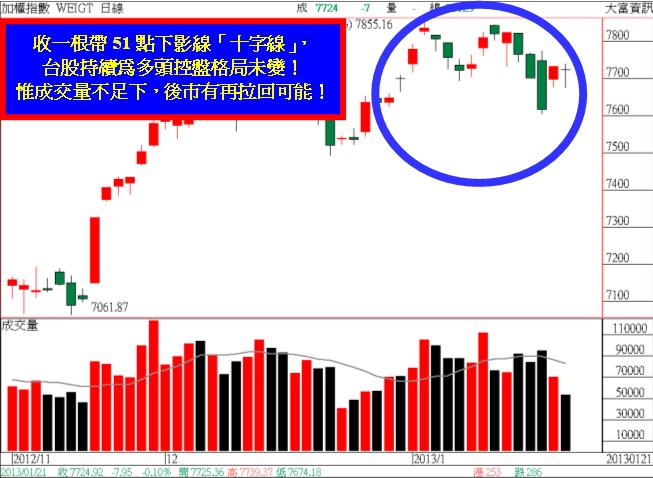 由於歐美股市上週五收盤見到漲跌互見格局,加上日、韓等亞股市場今日早盤,同樣跟進見到開盤跳空開高低走勢不一的情況,使得台股今天早盤也跟著見到小幅下跌7.5點的弱勢開盤格局,市場多頭無法成功延續上週五,大盤指數強彈大漲達116點的強漲格局,持續將大盤指數推升上漲回到7800點整數大關之上,仍舊見到短線市場上,多空雙方來回攻防、漲跌拉鋸的橫盤整理戲碼。