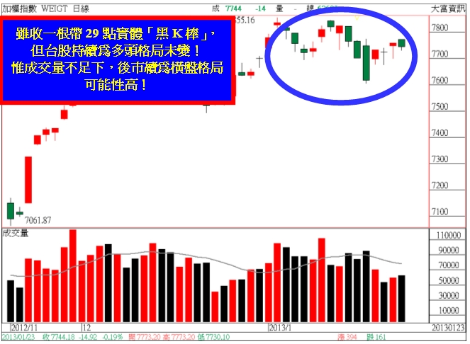 大盤指數本波自上週四(01/17)盤中低點-7603點所展開的短線反彈漲勢,波段漲勢累計最大達到170點、漲幅達2.24%,看起來,多方持續主導盤面走勢的台股態勢似乎依舊沒有絲毫的改變。不過,在大盤指數於極短時間內強彈大漲達170點的同時,唯一美中不足、稍嫌可惜的是,台股整體成交量水位卻持續無法透過盤面交易人氣的熱絡,而繼續累積增加達到至少八~九百億元以上的「波段漲勢攻擊發起必要量能」,使得大盤指數目前在盤面上所呈現出來的,依然是一個位處「7650~7850點」間的橫盤整理區間內,走勢格局並沒有明顯的改變跡象出現。