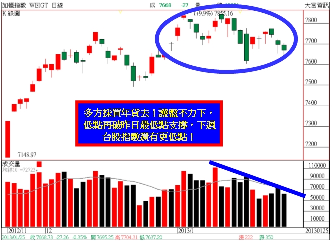 同時,由盤面上幾檔大型權值、指標性代表個股如:聯電、台積電、日月光、鴻海、聯發科、宏達電、大立光、玉晶光、漢微科等,今天盤中的走勢表現來觀察,其實可以相當清楚的看得出來,台股大盤在目前這個7650~7800點間的指數橫盤區間位置,可以說是相當清楚的看得出來,場上多方主力撐盤的力道仍相當的強勁。這一點,由盤中台股指數期貨的急拉超過40點強彈氣勢,就可以清楚的看得出來,多方並不打算有絲毫給場上空方作表現的讓步打算。