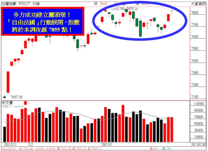 不過,在場上幾檔占大盤指數權值比重高、具重要指標意義的個股,如:聯電、台積電、鴻海、聯發科、宏達電、大立光、漢微科、宸鴻等,盤中的走勢表現普遍都呈現清楚的「乏善可陳」窘境下,也因而拖累了台股大盤在九點半以前的漲勢腳步與走揚節奏,使得大盤指數因此一度跌落至平盤點位以下,讓早盤時在市場上展開一輪攻堅漲勢的多方,一度給嚇出一身的冷汗。幸好,隨後在場上多方資金再度匯集、進場推升下,大盤指數得以再重新見到紅盤漲勢。