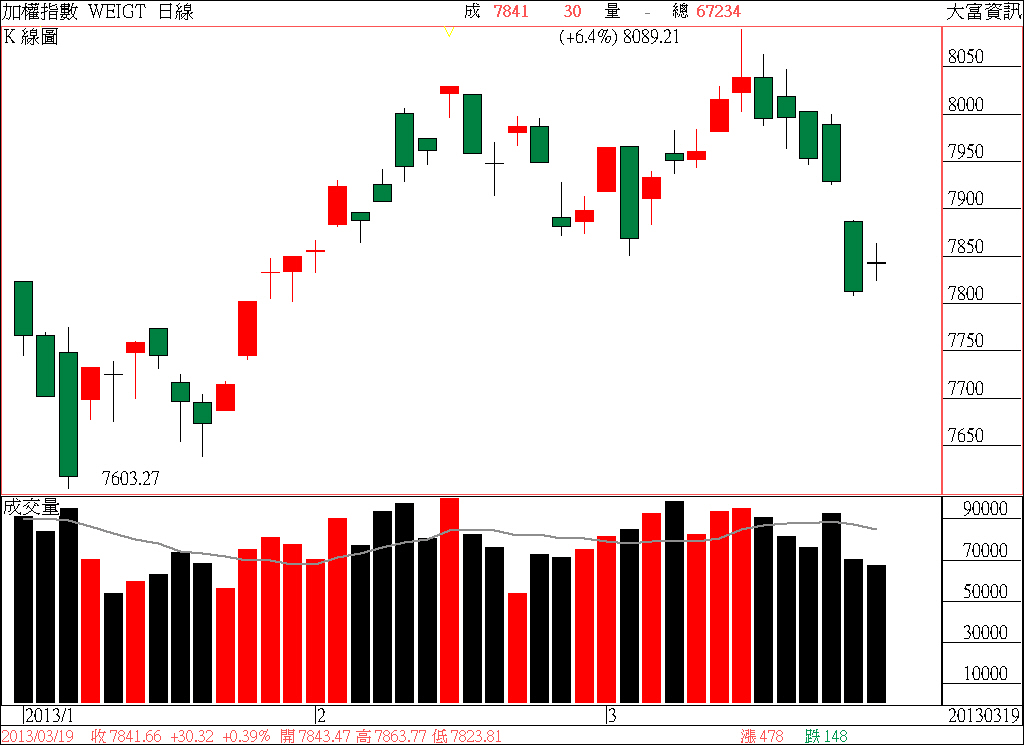 回到台股,8000點路本難行,無量的隱憂一直存在,每每上8000就出現拉東出西,全球股市大部份在相對高檔,只是順勢拉回。昨天已說過不是賣壓重而是沒有接手,大家在等美股反應,昨日美股還好,歐ECB也鬆口,亞股開盤回神,不過趨勢已形成,整理態勢難改變。3月進入中下旬,也是年報的公佈期,還可以的公司早早就報了,甚至很多公司也早公佈了股利政策,拖到越後面就是老話重提,醜媳婦終要見公婆。4月除了歐債外,還有個季報要面對。