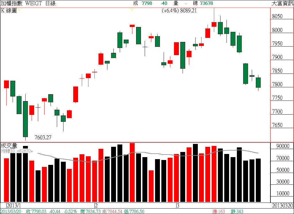 大盤量不亮,對大型股而言,本來推升動能有限,算算台積跌幅都超過1成。而團隊則一直強調中小型利基股當道,大盤集中市場算算回了3%多,但OTC則回約1%,而大盤2月高點8029早已跌破,但OTC卻還在2/20的高點之上,時間再度證明我們的說法。而在上週末我就說過了,雲端後4G網纖會隨後到,雖然有個別股因個別因素相對弱,但整體的走勢卻很明確,而我們贏家種類的會員,手中也不過兩檔個股,一檔上週回補的今日已漲2%以上,一檔開盤3分鐘不到漲停。產業對了股票就對了,要有守株待兔的精神,個股勝大盤。至於大盤短線區間昨日就告知了,尚未改變。哈囉,回300點囉!又命中。