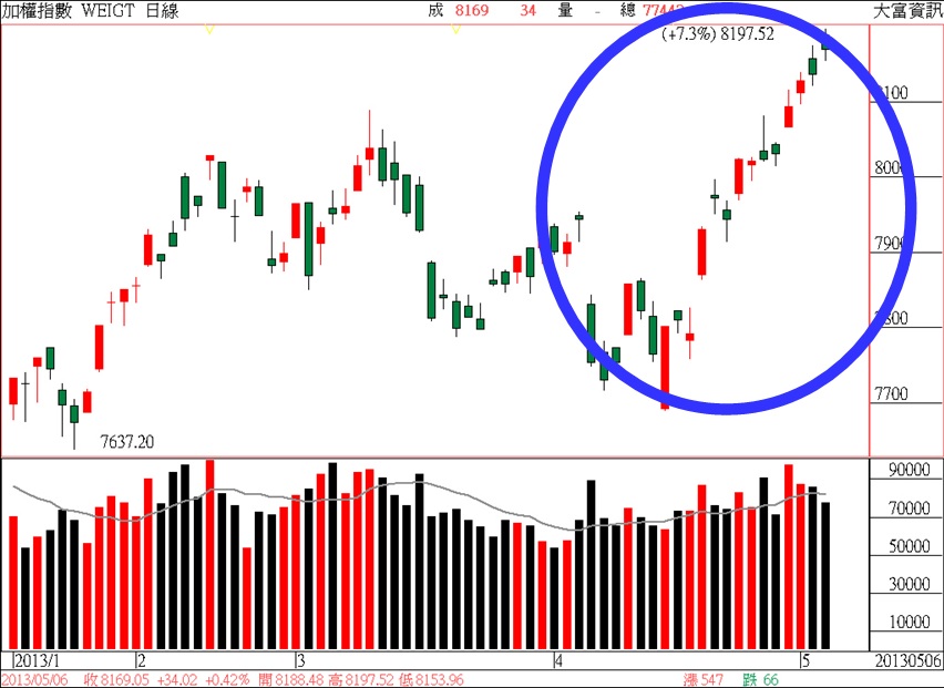 在歐美主要股市於上週五同步以紅盤漲勢作收,以及日、韓等亞股市場今日早盤同樣跟進以跳空開高之勢開盤的雙重激勵之下,使得台股今天早盤也跟著見到跳空開高58.9點的亮眼開盤漲勢,因此,就台股短線盤勢後市走向的展望而言,明顯依舊還是一個為市場多方所主導、控盤的走勢格局。台股大盤指數這一波延續自4月16日盤中低點-7688點以來的反彈回升漲勢,在市場投資參與者持續挾著高昂的作多意願及信心,以及充沛的資金動能挹注作強大後盾力挺下,短線持續見到續創這一波大波段回升漲勢以來的新高點位。