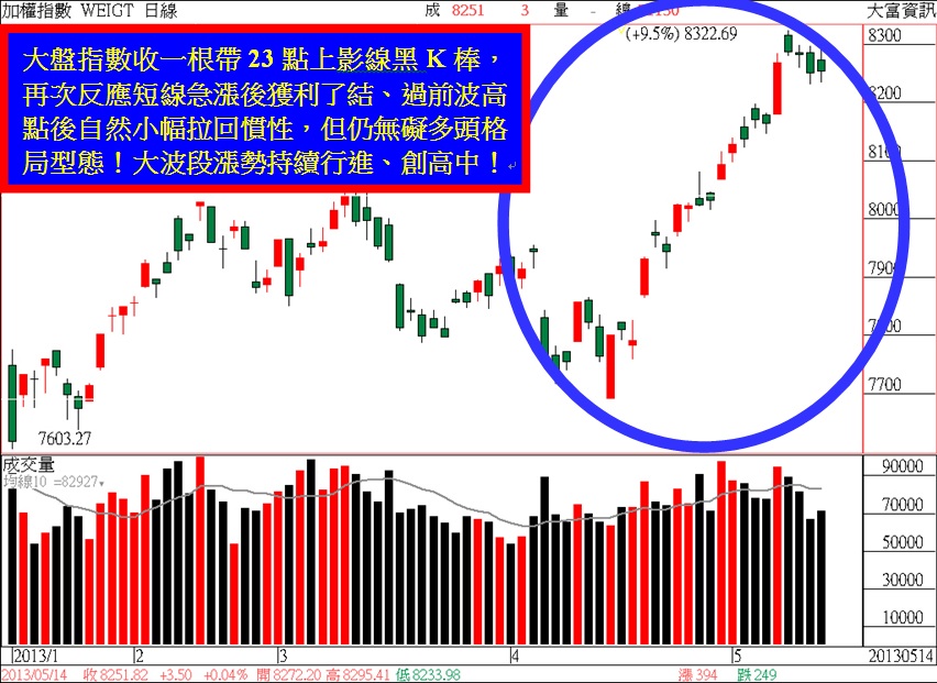 儘管歐美股市昨日收盤又再度見到紅黑盤交錯作收格局,但在日、韓等亞股市場今日早盤又再度雙雙見到跳空開高亮眼開盤漲勢的有效激勵之下,使得台股市場在今天早上一開盤之後,立刻見到跳空小幅上漲23.8點的紅盤漲勢,相當明顯可以看得出來,市場多方依舊想繼續維持住這一波大盤指數,自7688點強彈大漲600多點、8.4%以上漲幅以來,已經成功形成的多頭漲升型態,及一波接著一波持續上漲、屢創回升波段漲勢新高點位的強漲節奏,力求將大盤指數就算是最差的走勢型態,也要強力將其維持為一個明顯的「高檔震盪」格局型態!