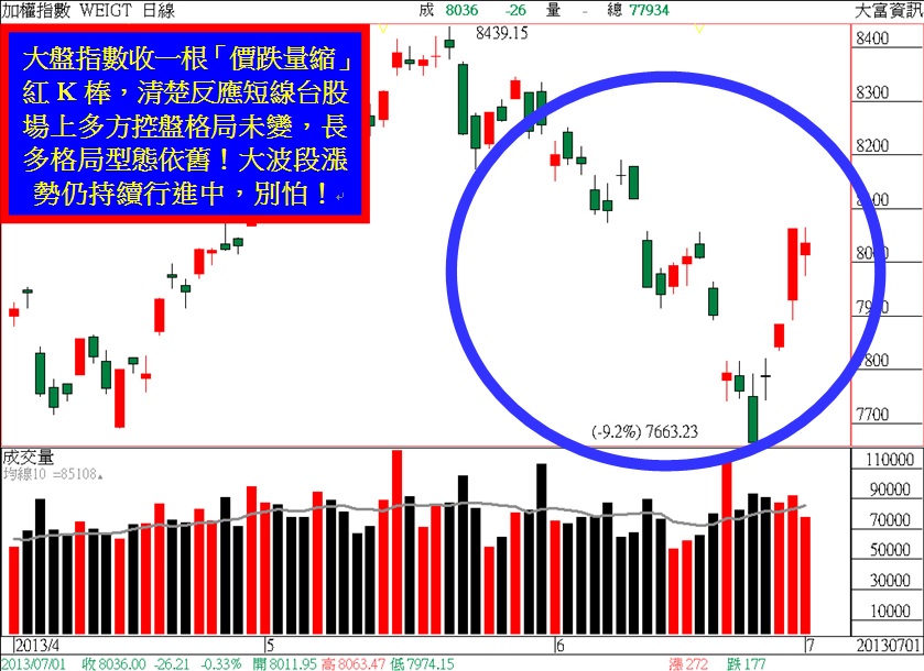 由於歐美股市各主要指數上週五見到紅黑盤不一走勢的交錯收盤格局,加上日、韓等亞股市場今日早盤一開盤後,也同樣見到開出高、低盤走勢不一的歧異型態,因此使得台股今天早盤一開盤後,未能延續上週五的跳空大漲紅盤長紅K棒漲升氣勢,而見到跳空下跌50.2點的短線強漲後的回跌走勢。