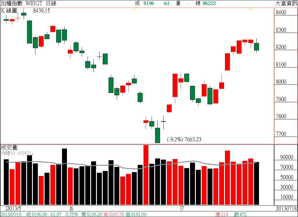 終場收盤時,加權指數以8196.98點作收,下跌61.97點,跌幅0.75%,市場成交總金額862.22億元。