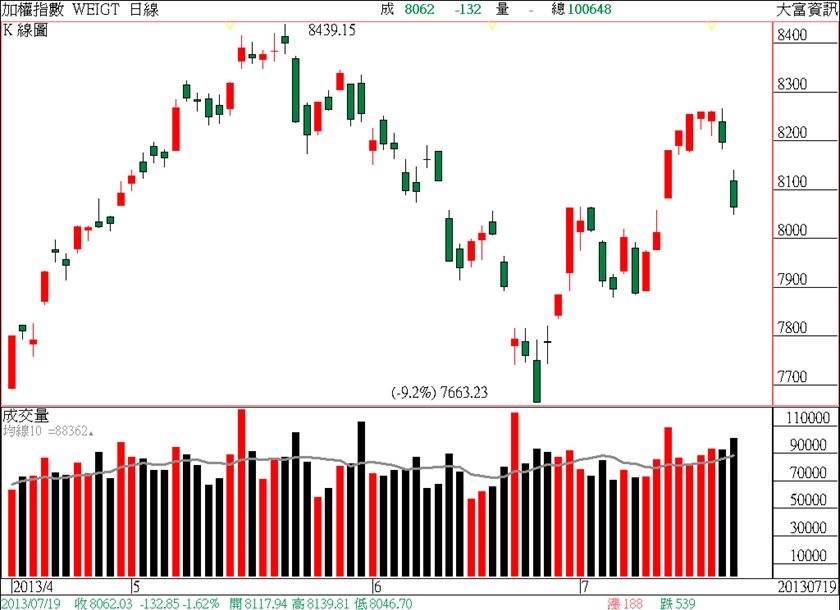 由於台積電於昨日法說會中公開指出,對後市第三、四季整體營運展望及營收成長幅度,力道恐怕將會不如原本預期水準,因此造成台積電美國ADR昨日收盤見到深達8%跌幅,所以儘管歐美股市各主要指數昨日收盤同步見到紅盤漲勢,而日、韓等亞股市場今日早盤一開盤後,也見到跳空開高的亮眼紅盤漲勢,但台股早盤一開盤後卻反倒因為受到台積電ADR的8%跌幅連帶衝擊影響,因此使得大盤指數在今天早上一開盤後,立即因為台股大型權值股重大利空消息的拖累而跳空下跌66.4點,市場空方暫時奪回台股短線盤勢走向的主導、控制權,也同時中止近期台股大盤指數,連續七個營業日創下,自7663點觸底翻揚、彈升漲勢以來連創指數新高亮眼漲勢盤局。