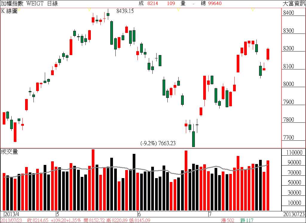 簡單來說,至少台股大盤目前就中期角度的盤勢觀察區間來看,仍舊為一個十分清楚的「中多格局」未變;短線的觀察角度而言,未來幾個交易日之內,只要大盤指數能夠接連創下反彈波段漲勢的新高點位,同時盤面整體成交量能水位也能見到持續性穩步量增格局的話,台股短線就會繼續維持「短多」格局不變。如此一來,很自然地,盤面個股後市的股價表現,只要本身具備一定的產業基本面利多題材,股價就很有機會在市場的多頭氣氛感染、支撐下,見到亮眼的漲勢格局。終場收盤時,加權指數以8214.65點作收,上漲109.20點,漲幅1.35%,市場成交總金額996.40億元。