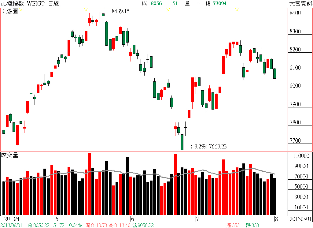 也就是說,短線而言,似乎依舊是市場空方在持續主導盤勢走向。對市場投資人而言,接下來只須密切留意台股大盤什麼時候見到「價跌量縮」、中長黑K棒現身的盤勢格局,自然就能夠及早把握住,台股下一波波段漲勢的轉折訊號與最佳的進場時機點!終場收盤時,加權指數以8056.22點作收,下跌51.72點,跌幅0.64%,市場成交總金額730.94億元。