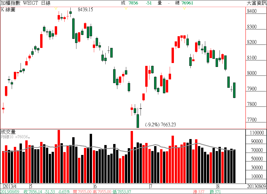 因此,就目前台股大盤所處的指數點位而言,可以說正處在一個相當重要的關鍵位置,市場多方必須使盡吃奶力氣,全力將大盤指數守穩於7834點之上。要不然,一旦大盤指數再度跌回到7800點整數關卡以下的話,接下來市場投資人將會再看到另外一波,台股指數跌破7663點-中多格局重要下檔支撐點位的大波段回檔跌勢。屆時,盤面上個股的股價,恐怕也將跟著「江河日下」、「一洩千里」。終場收盤時,加權指數以7856.14點作收,下跌51.53點,跌幅0.65%,市場成交總金額769.61億元。