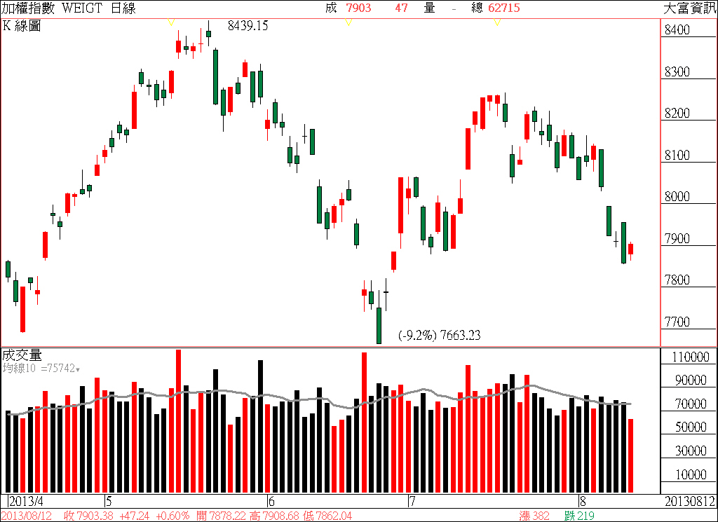 因此,就台股短線後市的走勢演變規劃而言,一旦場上多方無法適時、持續性展現「夠力(九百億元以上)」的護盤實力,大盤指數將會持續受制於市場空方的摜殺、壓盤,而繼續下探本波自七月中旬8265點反轉向下、回檔修正跌勢波段的新低點位,更有可能會進一步觸及六月下旬前波起漲彈升波段的起漲點-7663點。果真如此的話,盤面個股的股價也將因此免不了,跟著看到新一波的回檔修正跌勢。終場收盤時,加權指數以7903.38點作收,上漲47.24點,漲幅0.60%,市場成交總金額627.15億元。